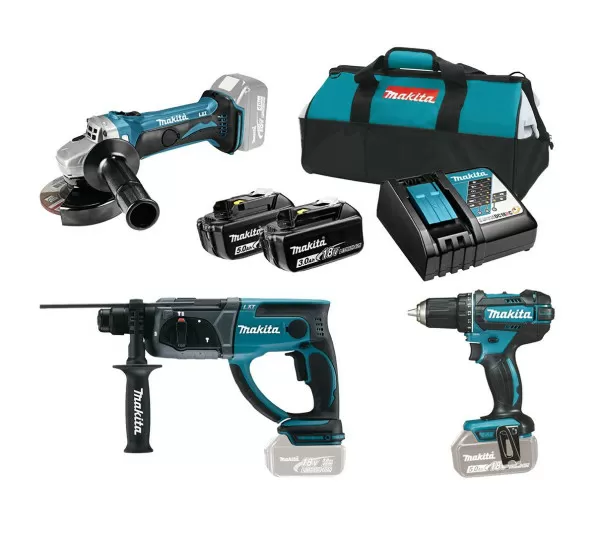 Makita LXT 18V Akumulatorski set bušilica-odvijač + bušilica-čekić + ugaona brusilica, 1x3.0Ah, 1x5.0Ah,